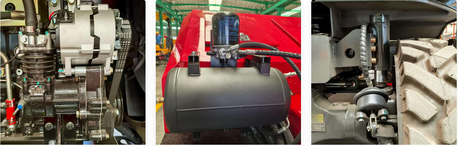 Для обеспечения стабильной подачи воздуха и надежной работы тормозной системы предусмотрен отдельный небольшой воздушный компрессор. Кроме того, предусмотрен ресивер, который хранит сжатый воздух, стабилизирует давление воздуха во время работы оборудования, снижает колебания давления, вызванные частыми пусками и остановками воздушного компрессора, и обеспечивает стабильный источник воздуха для пневматической системы.